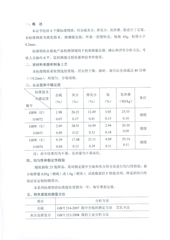 陕西省能源质量监督检验所/国家煤炭质量监督检验中心(西安)标准物质认定证书